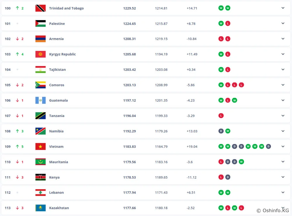 Кыргызстандын улуттук курама командасы ФИФАнын жаңыртылган рейтингинде жогорулады.